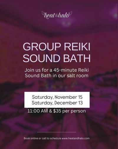 Join us every Wednesday 6pm for a deeply calming Reiki Sound Bath, offered within the peaceful setting of Heat and Halo’s Himalayan Salt Lounge—a sanctuary designed to soothe your body, mind, and spirit. $35 per person